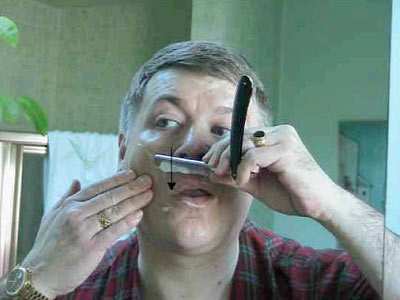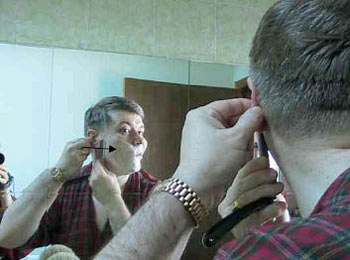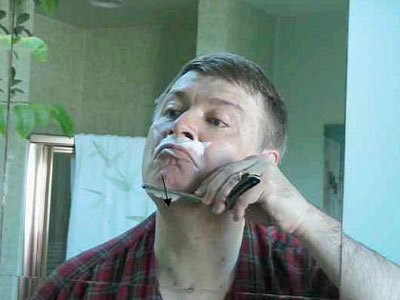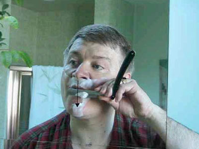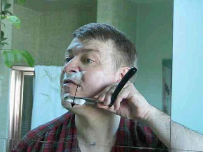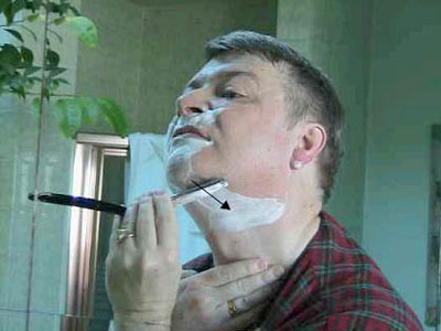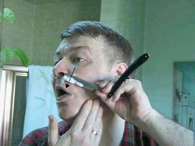 Вернемся к бритью – возьмите лезвие в удобную руку. Положите большой палец на обратную сторону черенка ("позвоночника") бритвы, указательный, средний и безымянный пальцы на его верх, и мизинец на острие, так, чтобы "пятка" торчала между безымянным пальцем и мизинцем. Перед тем, как лезвие коснется щеки, проясним некоторые вещи. Оптимальный угол между лезвием и кожей – около 30 градусов, при слишком маленьком бритва пройдет по волосам, не срезая их, а при слишком большом вы можете порезаться. С другой стороны, лезвие безопаснее во время движения. Оно достаточно остро для того, чтобы врезаться в кожу, если задержится в одной точке на коже и угол будет слишком тупым или давление слишком сильным. Не буду продолжать, иначе, это отобьет у вас все желание. Итак, не бойтесь перемещать лезвие по лицу, но будьте уверены, что вы двигаетесь под правильным углом, никогда не ставьте лезвие боком или параллельно. В этом случае вы порежетесь. Для другой стороны лица мы поменяем руку.