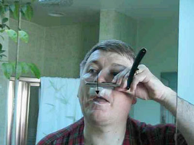 Самый легкий способ начаться состоит в том, чтобы положить плашмя бритву на кожу щеки и затем, немного приподняв черенок, немедленно начать перемещать бритву вниз по щеке, чтобы сделать первый проход. Несильно надавливайте. Пальцами другой руки натягивайте кожу – это создает для бритвы гладкую поверхность для бритвы, это поможет ей скользить и уменьшит шанс порезаться, делает бритье более чистым и удобным. Я помню как дрожь в руках, когда я делал это в первый раз, но я знал, что это возможно сделать, и когда-то действительно было сделано каждым небородатым человеком в мире. Все фотографии сделаны через зеркало, это поможет вам понять что вы будете видеть: